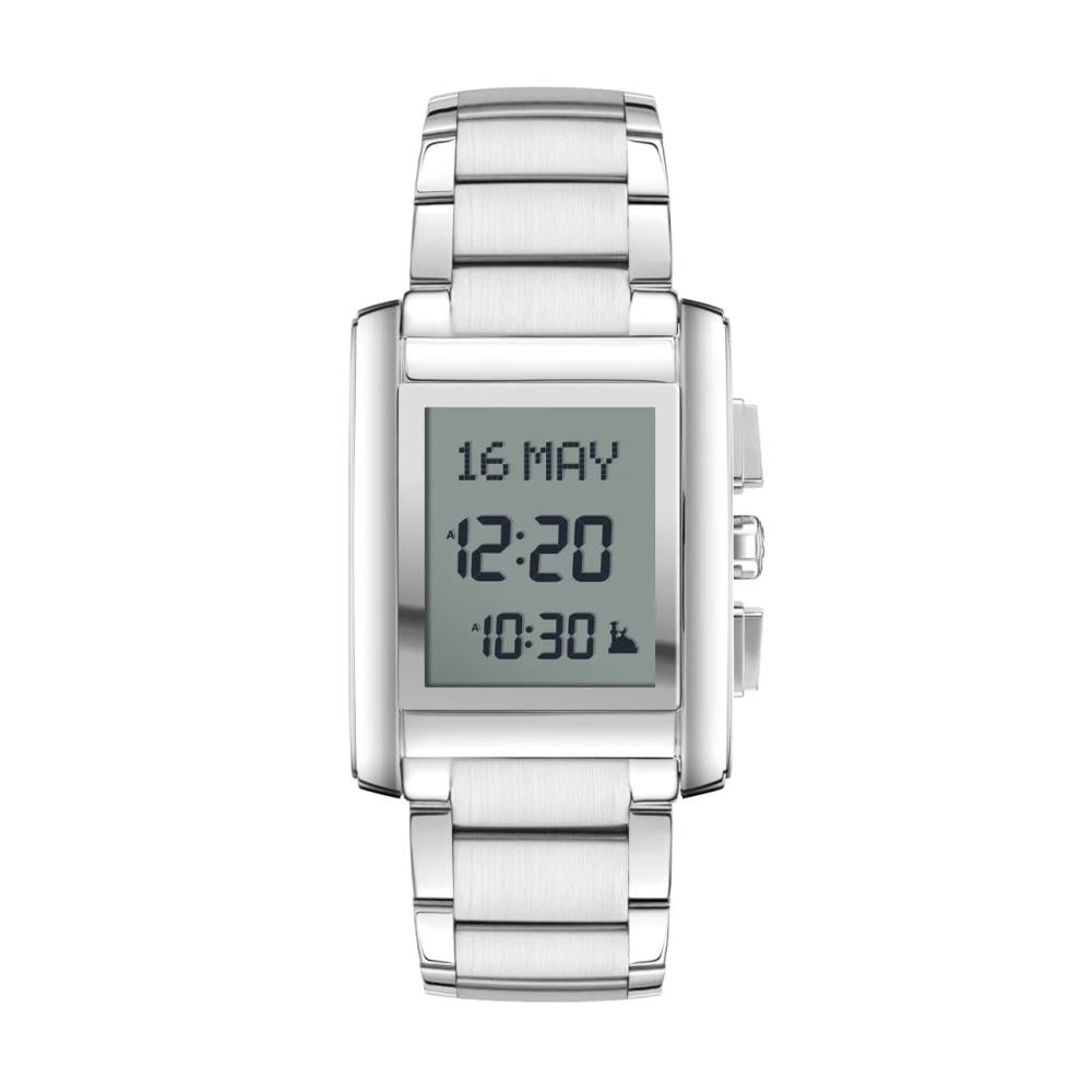 سـاعة كلاسيكية ذات هيكــل فضي مستطيل من الفولاذ المقاوم للصدأ ، مــزودة بـشــاشـة بـلـوريـة ، مــع إضـاءة خلفيـة.